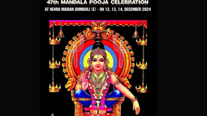 ഡോംബിവലി ശ്രീ അയ്യപ്പ സമിതി (രജി.) യുടെ 47മത് മണ്ഡല പൂജയാണ് ഡിസംബർ 12,13,14 തീയതികളിലായി നടക്കുന്നത്. ഡോംബിവ്ലി ഈസ്റ്റിലുള്ള നെഹ്രു മൈതാനിൽ സംഘടിപ്പിക്കുന്ന മണ്ഡല പൂജ 12.12.2024 ന് വ്യാഴാഴ്ച രാവിലെ 5.30 മണിക്ക് ഗണപതി ഹോമത്തോടെ ആരംഭിക്കും. തുടർന്ന് പ്രതിഷ്ഠ, 9.00 മണിക്ക് ഭഗവത് ഗീത പാരായണം, ഉച്ചയ്ക് 12.30 ന് അന്നദാനം വൈകുന്നേരം 7.00 മണിക്ക് ദീപാരാധന 7.30 മുതൽ കലാഞ്ജലി അവതരിപ്പിക്കുന്ന ഭരതനാട്യം.