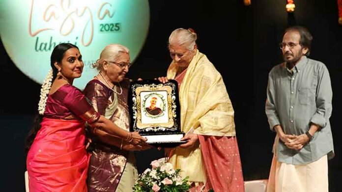 Photo: ആജീവനാന്ത പുരസ്കാര നിറവിൽ ലീലാ വെങ്കിട്ടരാമൻ. കലാമണ്ഡലം സുഗന്ധി, ഡോക്ടർ നീനാ പ്രസാദ്, വിശ്വനാഥ് കലാധരൻ എന്നിവർ വേദിയിൽ